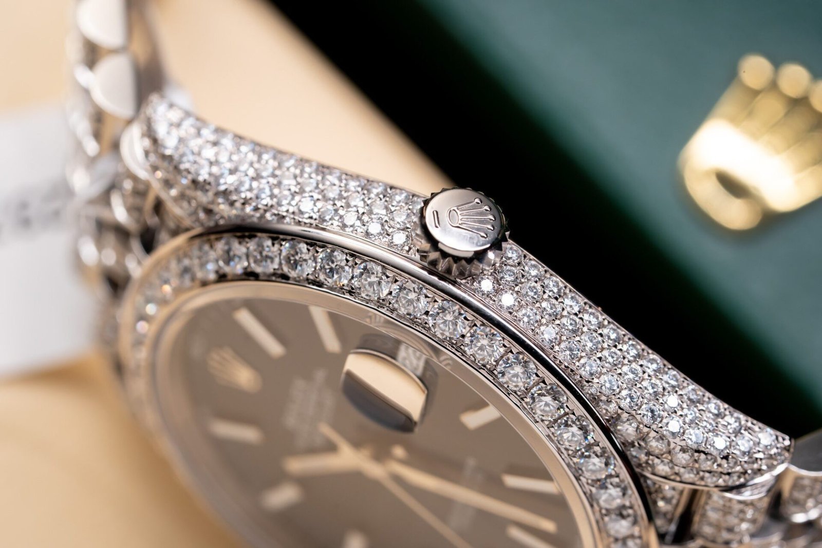 - Markers: Full diamond moissanite hour markers for luxurious elegance