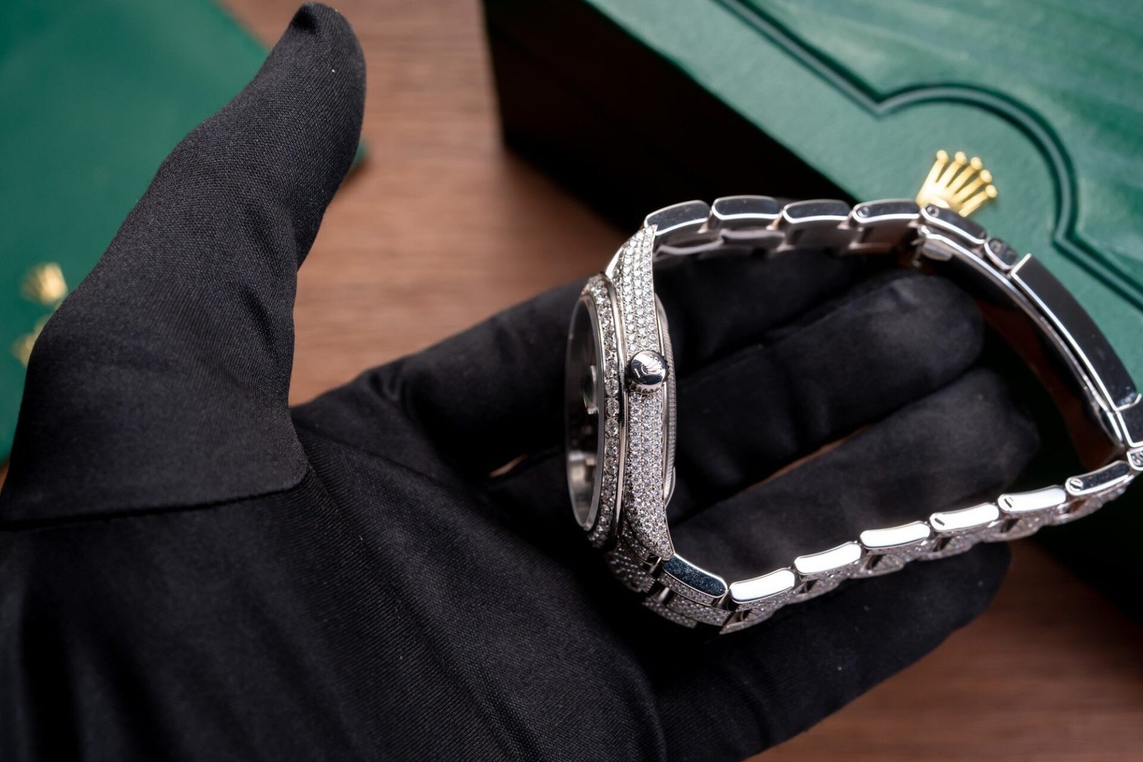 - Markers: Full diamond moissanite hour markers for a luxurious look