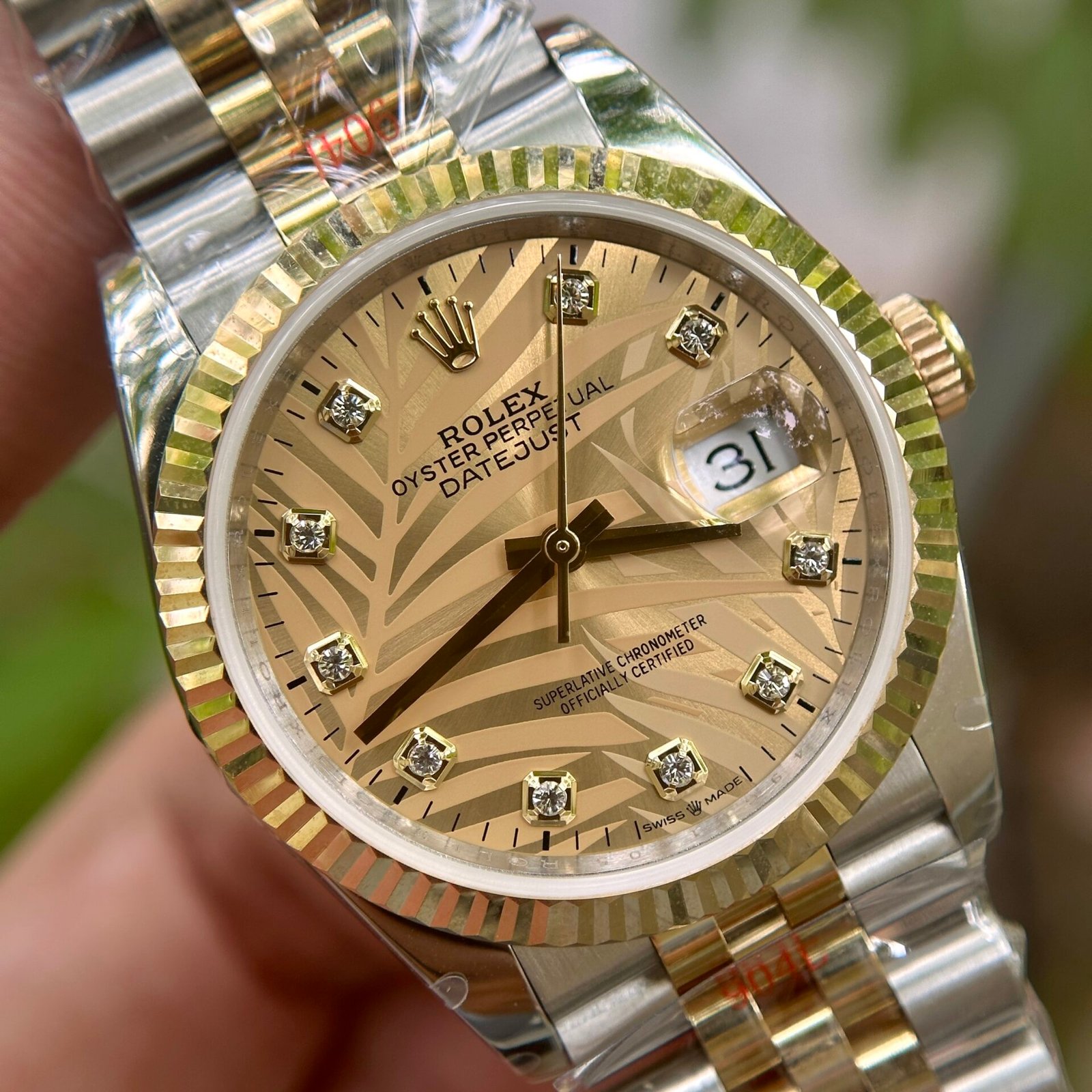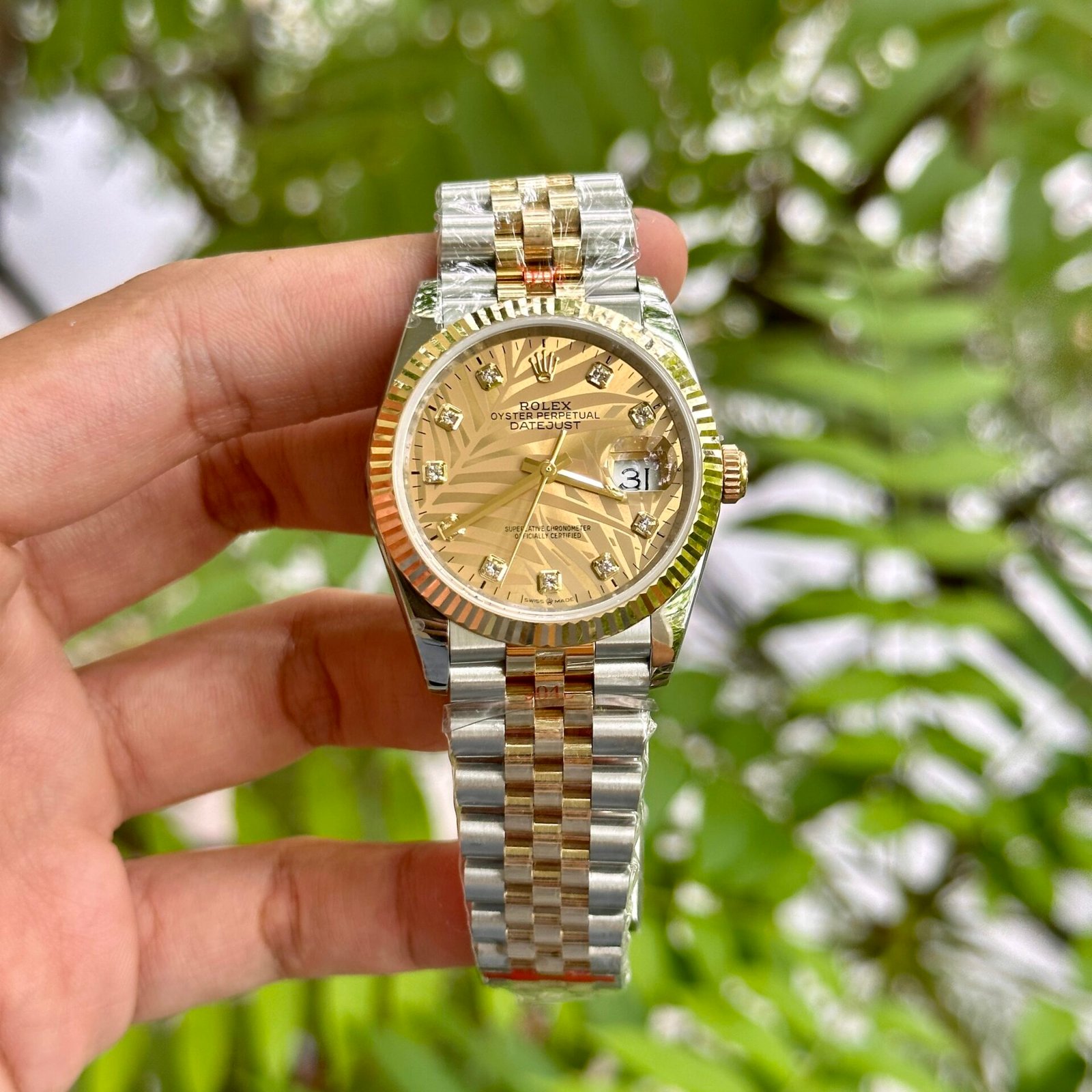 Rolex DateJust 18K Gold Wrapped Super Clone Watch Palm Leaf Dial GM 36mm