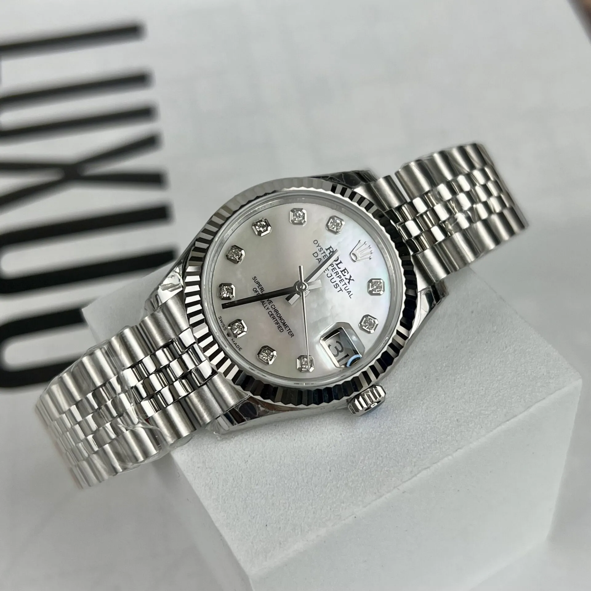- Markers: Diamond-set hour markers