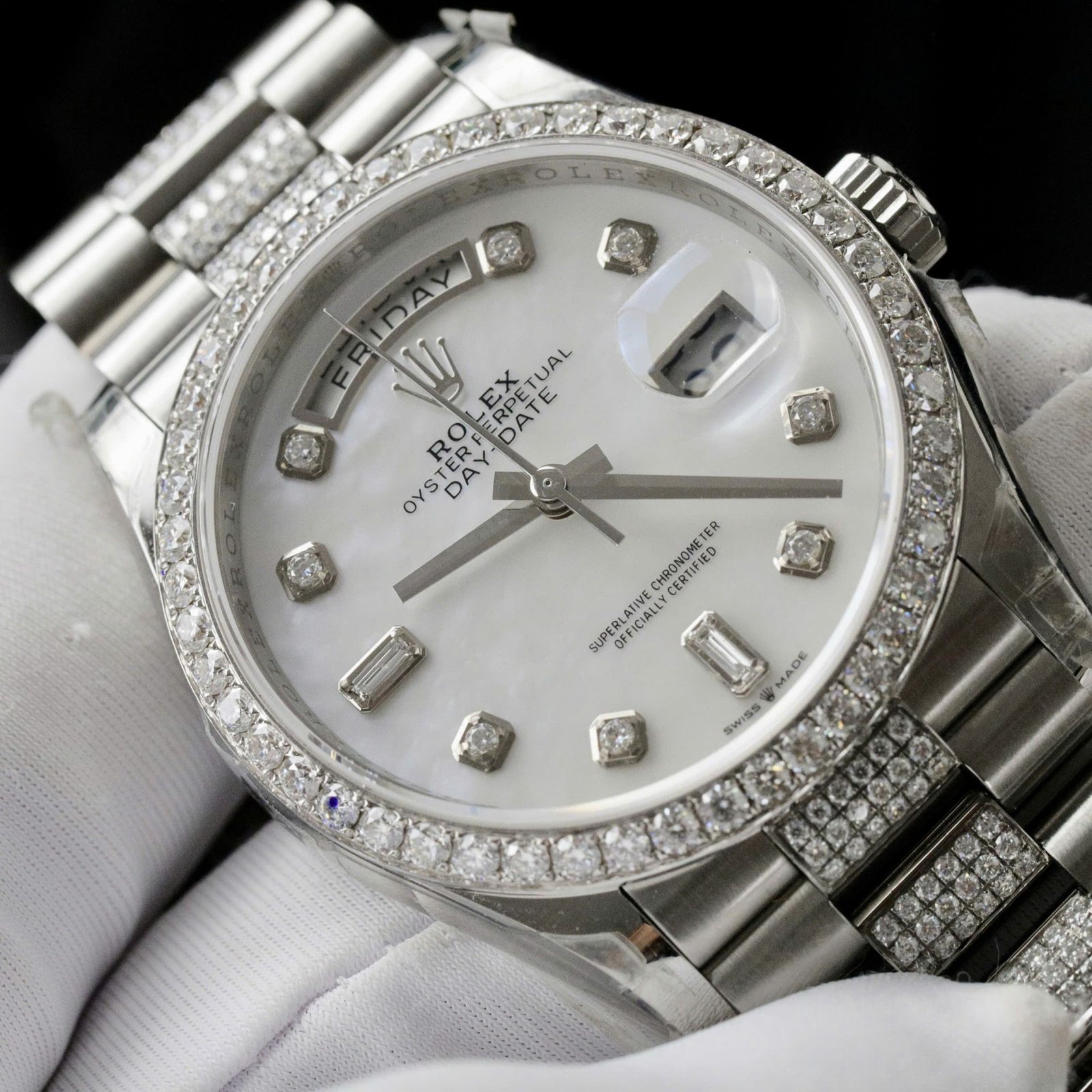 Rolex Day-Date Dial MOP Super Clone Watch Custom Moissanite Diamonds 36mm