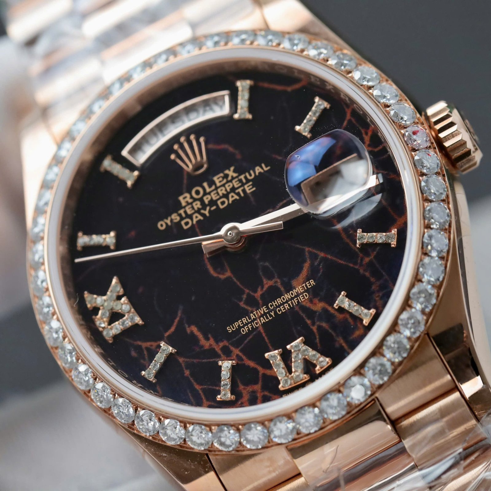 Rolex Day-Date Eisenkiesel Dial Super Clone Watch Gold Wrapped + Diamonds Moissanite GM Factory 36mm